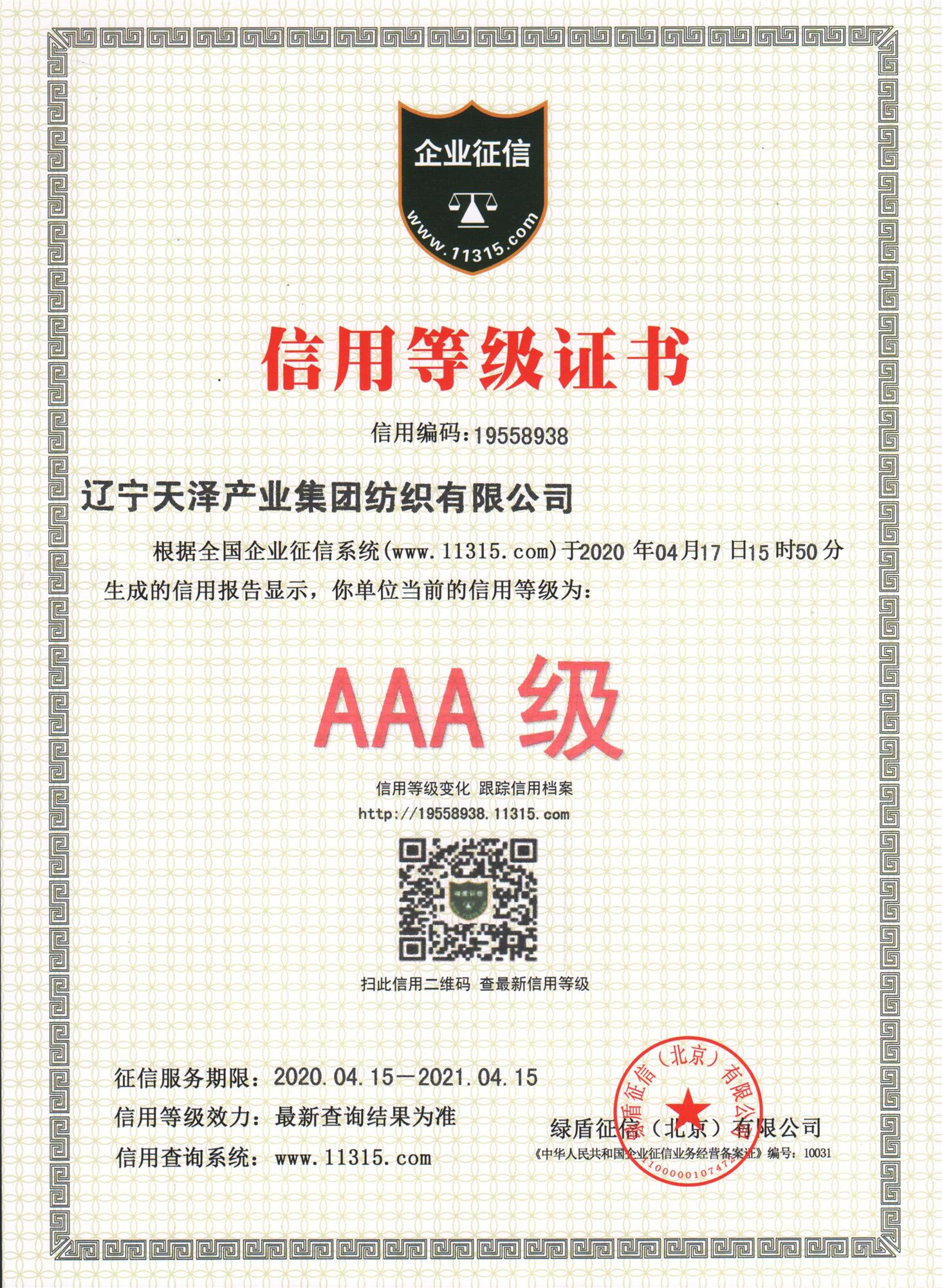 遼寧天澤紡織公司雙獲得“企業信用等級AAA級”